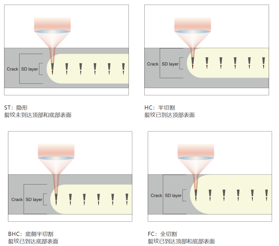隱形切割技術(shù)可將能夠穿透材料的波長的激光光束聚焦,在內(nèi)部聚焦并形成晶圓破裂的起點(diǎn)(改性層:隱形切割層,以下稱為“SD 層”),然后向晶圓施加外部應(yīng)力,將其分離。該過程主要由兩部分組成,一般被稱為激光改制過程與晶圓擴(kuò)展分離過程,